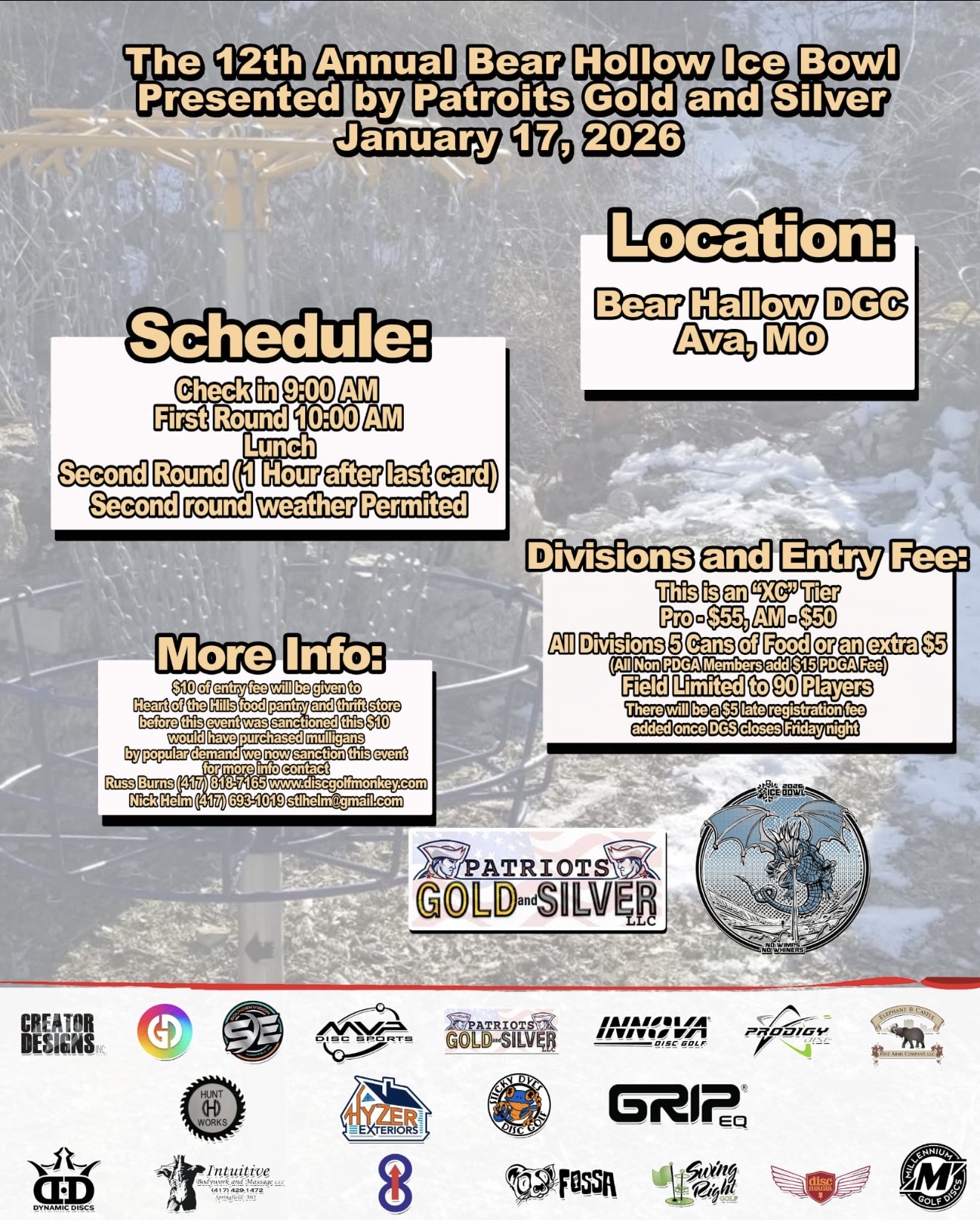 Our tour sponsors: Patriots Gold & Silver, Elephant & Castle Fine Arms, Dynamic Discs, Innova Champion Discs, Fossa Disc Golf, Prodigy Discs, Creator Designs, MVP/Axiom Discs, Millennium Golf Discs, Discmania, Educational Disc Golf Experience, Grip EQ, Slim Chickens, 8Up, Greazy Dyes, Discs Unlimited, Swing Right Golf, Intuitive Body Works & Massage and Sticky Dyes
