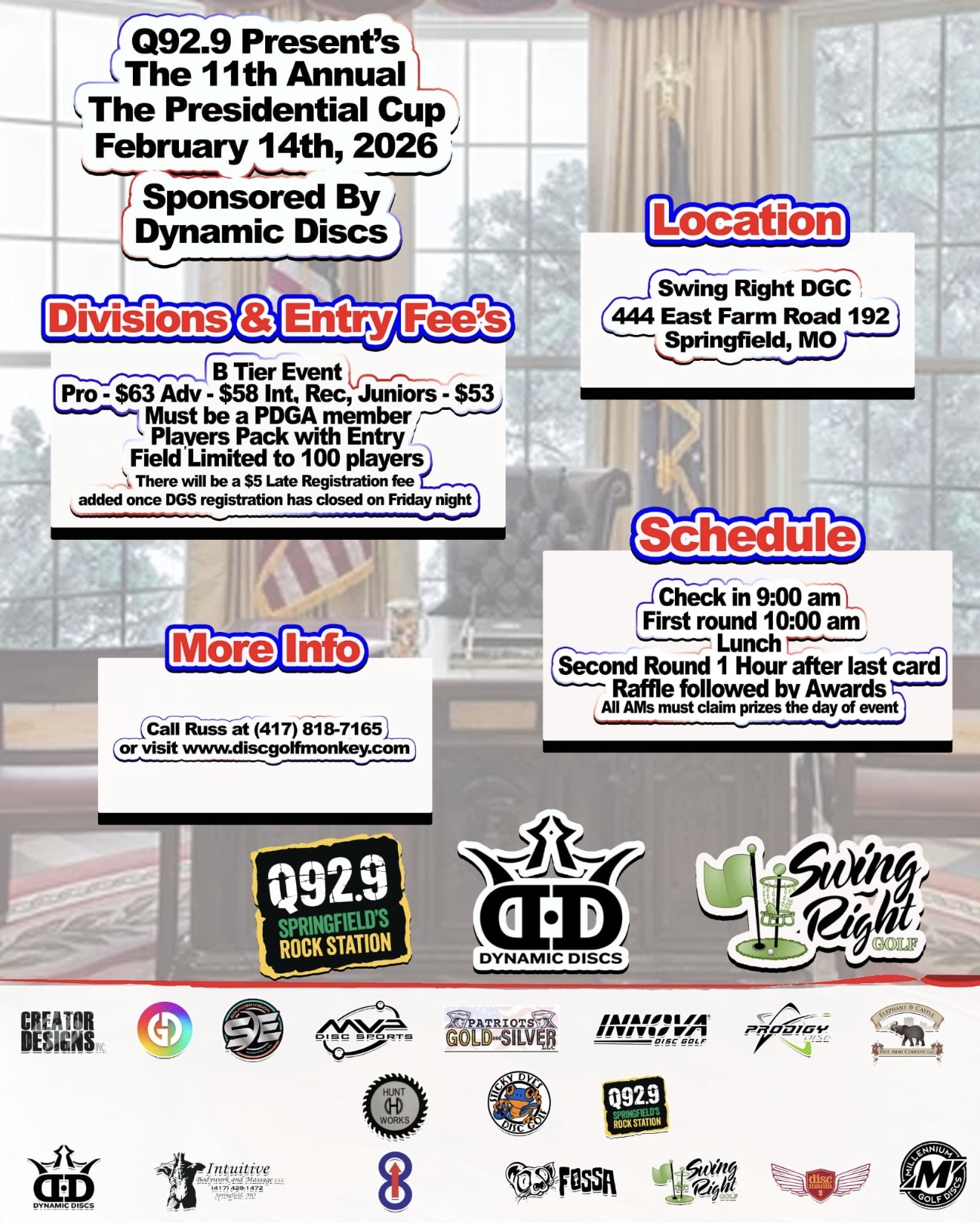 We also want to thank our tour sponsors for their continued support: Elephant & Castle Fine Arms, Patriots Gold & Silver, Dynamic Discs, Innova Champion Discs, Fossa Disc Golf, Prodigy Discs, Creator Designs, MVP/Axiom Discs, Millennium Golf Discs, Discmania, Educational Disc Golf Experience, Grip EQ, Slim Chickens, 8Up, Greazy Dyes, Discs Unlimited, Swing Right Golf, Intuitive Body Works & Massage and Sticky Dyes.